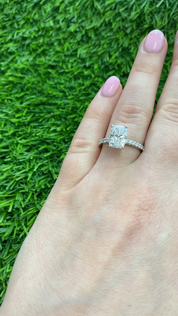 At 7:45AM, post-workout, Joey comes up to me and says he’s ready to propose to Tina. I had no blood flowing to my head by then. I think I said congrats. When I got to the office, I sourced the most-brilliant elongated Cushion Diamond available (Tina loves these). Joey picked out this setting. Here’s the finished Ring, with a 1.93 carat, IGI Graded “E” Color & “VS1” Clarity Cushion Diamond, beautifully-cut for max sparkle.