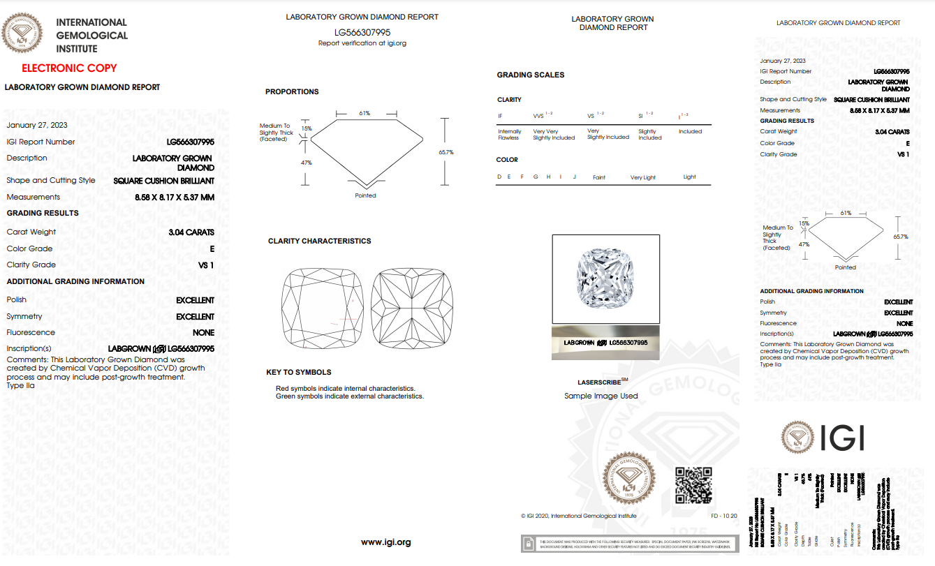 3.04 carat IGI Graded Lab-Grown Cushion Diamond