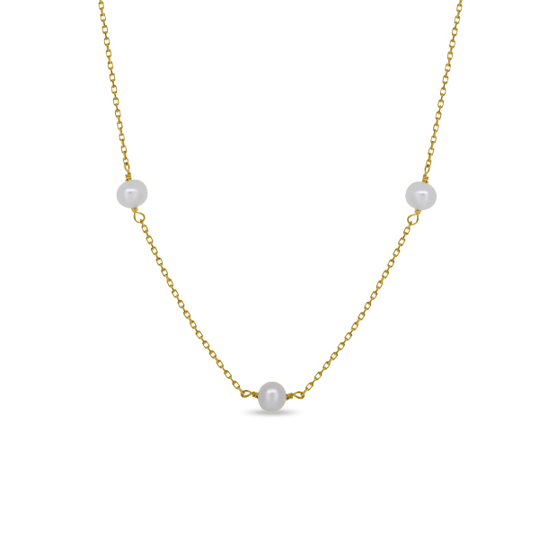 A dainty and beautiful pearl necklace with 9 x 4.25 mm cultured Grade A white freshwater pearls on 14kt Yellow Gold cable chain, 18” long.