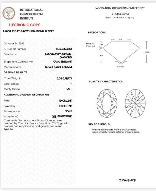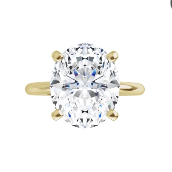 18kt Yellow Gold Engagement Ring, 1.70-1.80 mm wide band, high-set for stacking. Finger size 5.75. Set with 3.04 carat Oval LG Diamond (IGI 604394283)