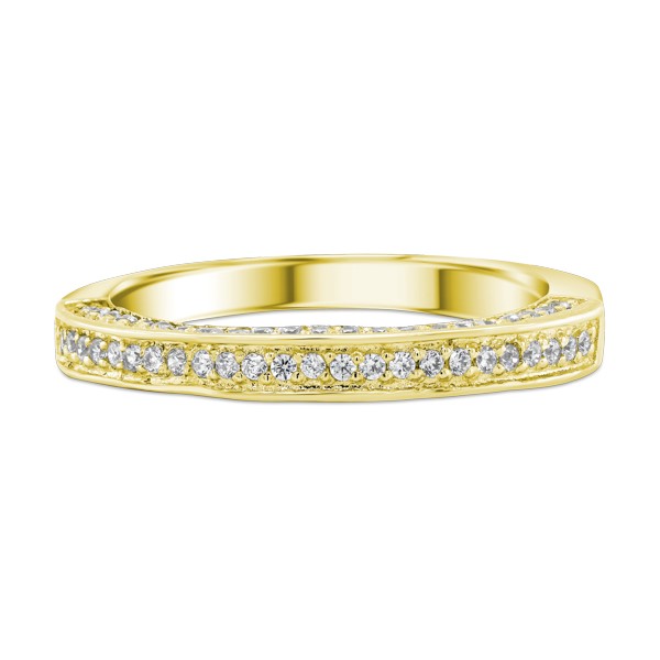 A gorgeous wedding ring with diamonds on the top, middle and bottom of the shank. Sparkle from all angles.